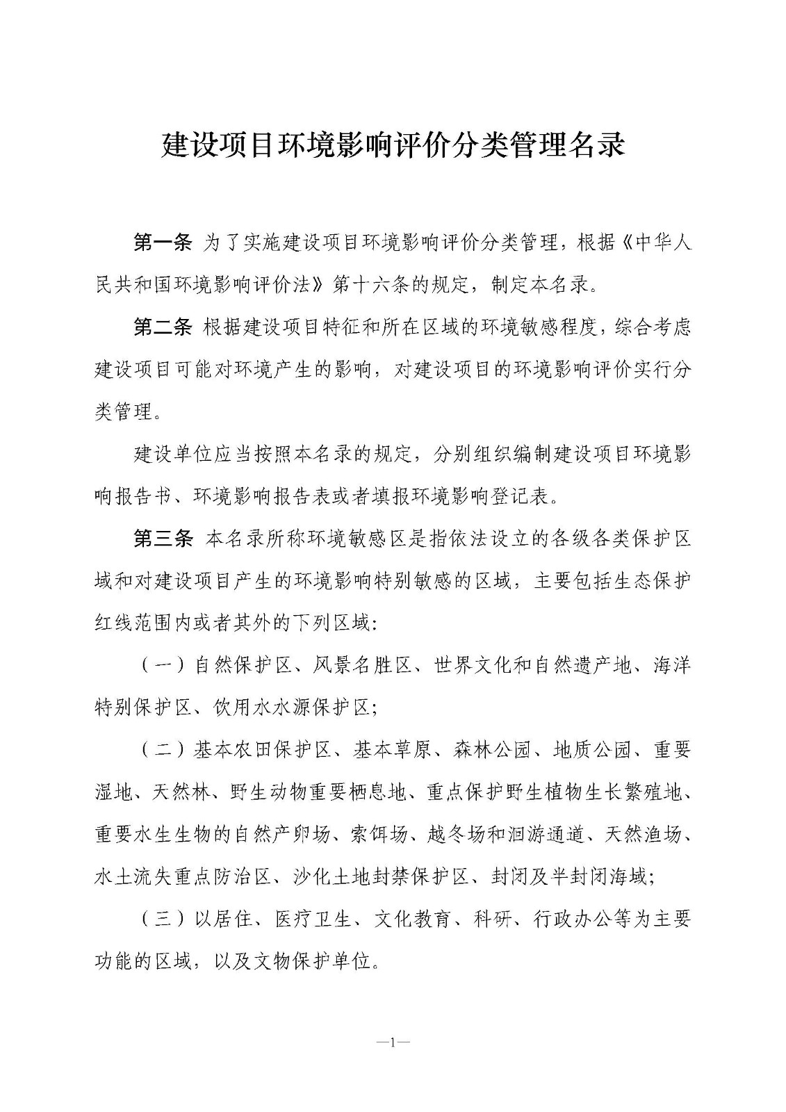 第一條 為了實施建設項目環境影響評價分類管理,根據《中華人民共和國環境影響評價法》第十六條的規定,制定本名錄。
